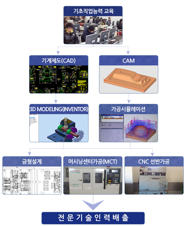 - 산업현장에서 필요로 하는 CAD/CAM을 이용하여 CNC선반 및 머시닝센타 등 각종 공작기계를 운용하는 기능인 양성.